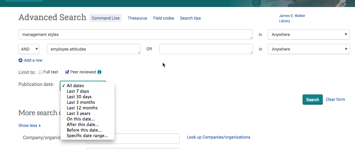 Both of these databases focus on business subjects and allow you to limit to full-text articlesand peer-reviewed sources. You can also select Full Text before you press the Search button.